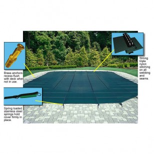 Durable, long-lasting Arctic Armor covers are strong enough to support your entire family, yet light enough to put on or remove from your pool in five minutes or less. Arctic Armor covers are made of super-strong two-ply mesh with a break strength of over 4,000 lbs. During use, the cover is held in place with brass anchors. These anchors recess flush with the deck when the cover is not in use. Rest assured that your children and pets are protected from accidental drowning. In addition to its safety features, Arctic Armor affords excellent winter protection for your pool. Its fine, lightweight mesh allows rain to seep through but screens out leaves and debris. Spring clean up is a snap because no water collects on the cover. The cover comes complete with brass anchors, stainless-steel springs, installation tool and storage bag. Backed by a 12-Year Warranty. Many sizes available.